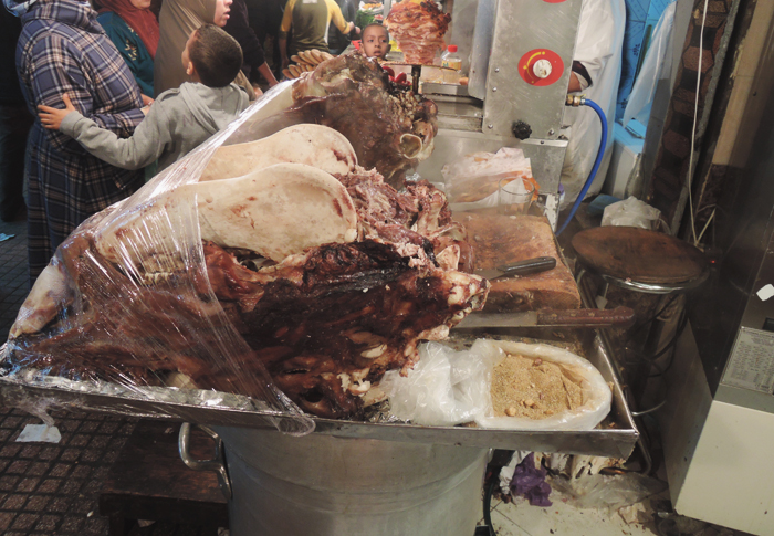 niezidentyfikowane mięso z głowy niezidentyfikowanego zwierzęcia (?! mówiłam, była przygoda) – 20 Dh, świeże krewetki – 70Dh/kg. [przelicznik: 2zł~5Dh]